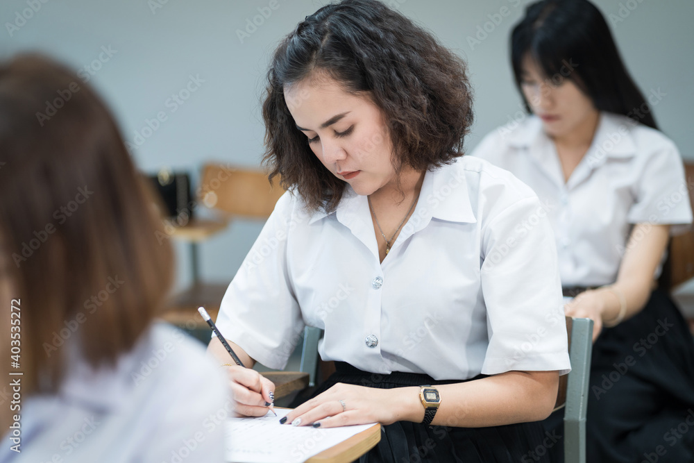 Selective focus of the teenage college students sit on lecture chairs do final examination and write on examination paper answer sheets in the classroom. University students in uniform in classroom.