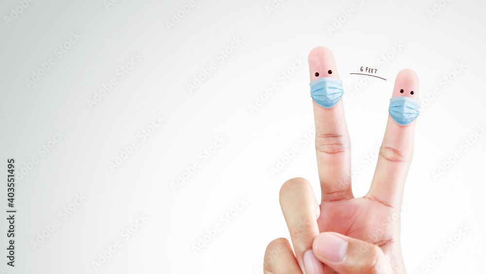 A doctor hand wearing a mask with fingers raised for encouragement and social distance concept.