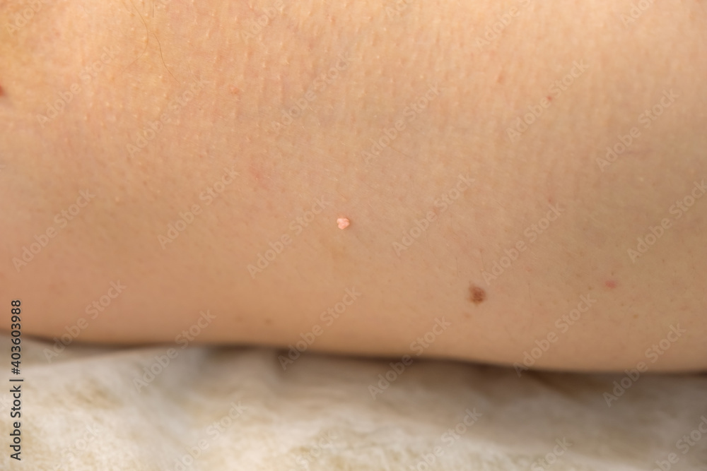 Red small papillomas on man's body near the nipple before laser removing procedure, closeup view. Man in clinic is preparing to laser removing of nevus, moles or papillomas.