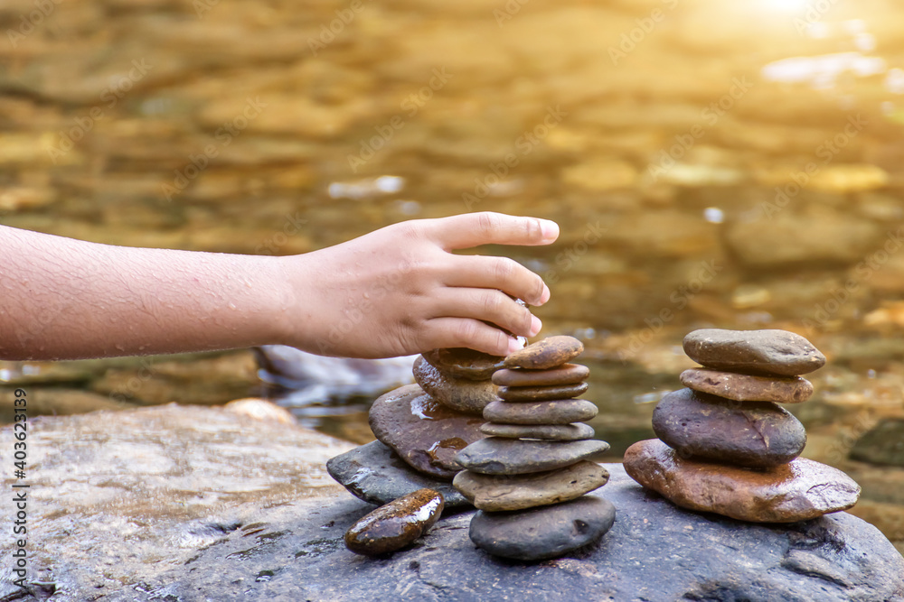Child hand placing a rock stacks on top of a cairn on creek,Blurred background.