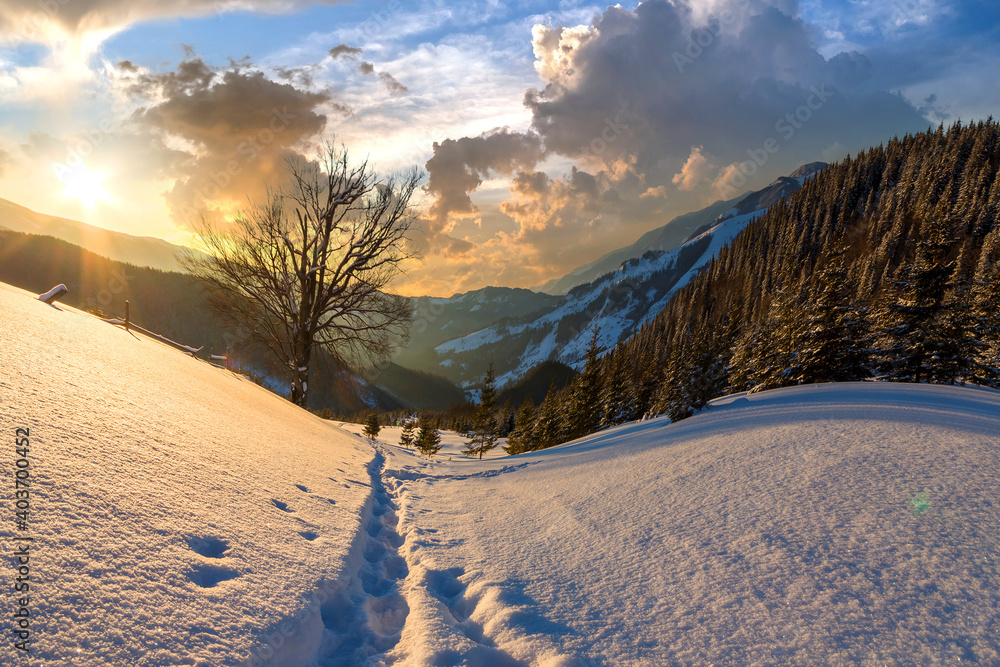 Human footprint track path in white deep snow through empty field with woody dark mountain range and soft glow on horizon at sunset.