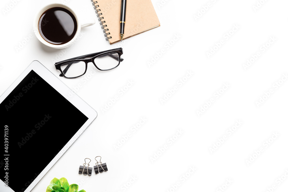 Flat lay, top view office table desk. Workspace with, laptop,office supplies, pencil, green leaf, and coffee cup on white background.