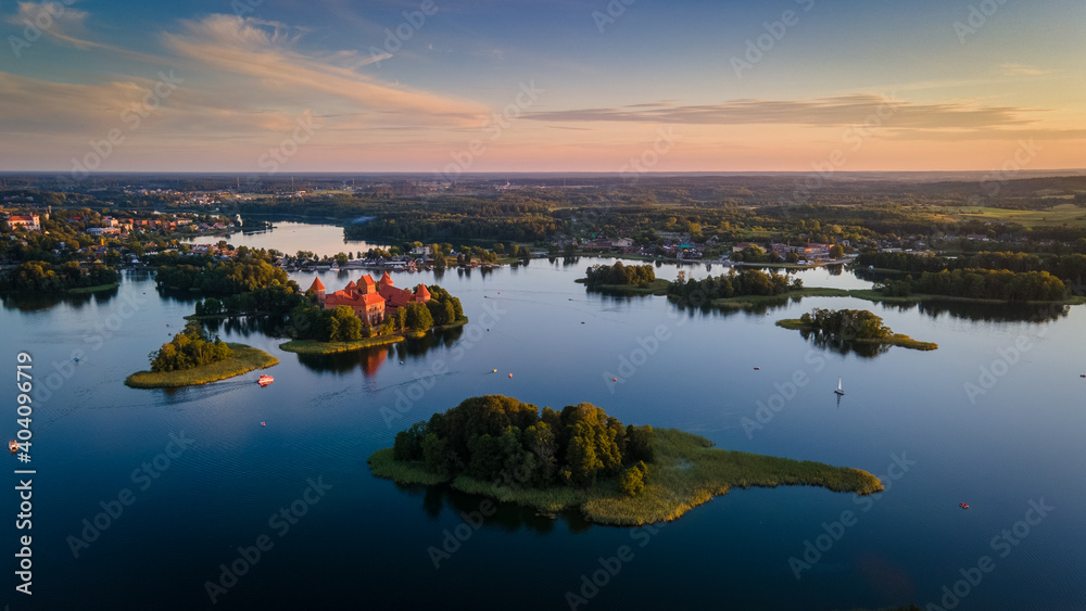 Aerial view of Trakai castle on the island of lake Galve by drone