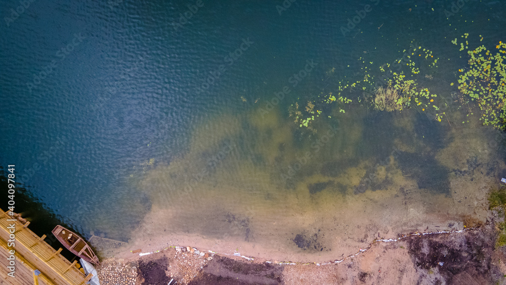 Top down view of Dubingiai lake beach by drone
