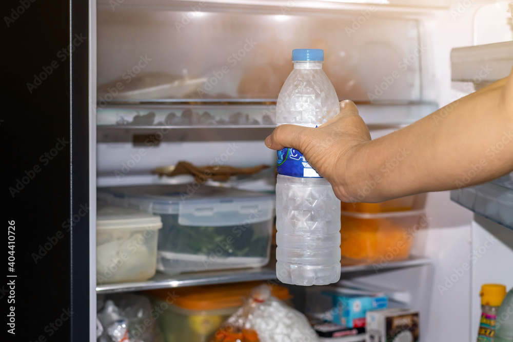 Woman opening refrigerator door with bottle of fresh water near open fridge, closeup