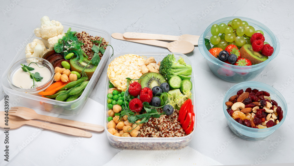 Takeaway lunch boxes with homemade nutrition food. Organic vegan meals.