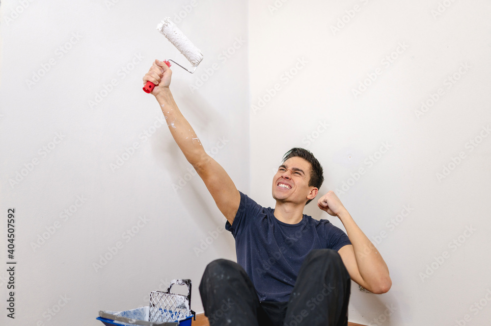 Young happy man portrait holding paint roller with raised arm. Painting, positive emotion, concept with copy space.