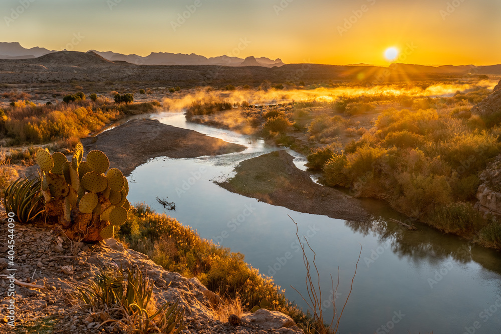 A prickly pear cactus and the sun rising over distance mountains and a river meandering below, Rio Grande River, Big Bend National Park, Texas