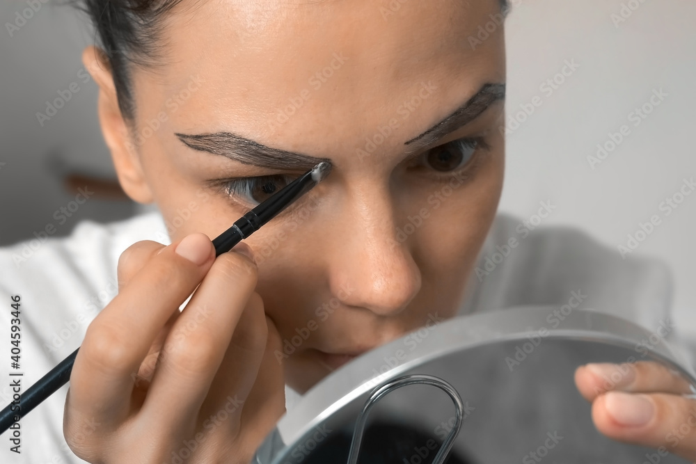 Woman is applying paint on eyebrows between the contour lines looking at mirror usinf a brush making beauty procedure at home, closeup view. Modern trendy styling, correction, coloring of eyebrows.