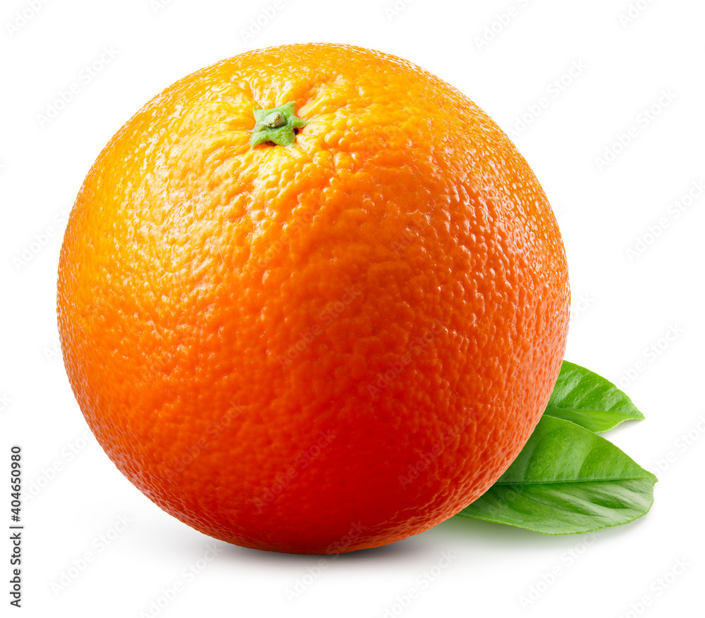 Orange fruit isolate. Orange citrus on white background. Whole orange fruit with leaves. Clipping path. Full depth of field.