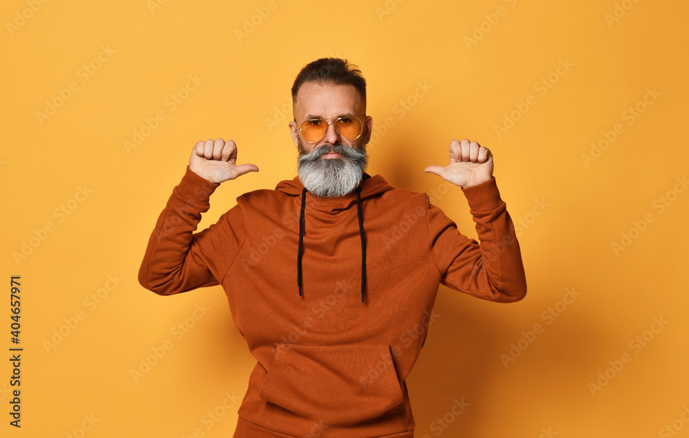 Portrait of smiling elderly hipster with beard wearing orange hoodie pointing at himself against yellow background