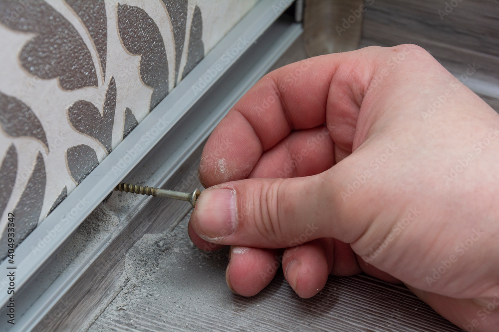Construction work, plinth installation, floor repair. Installing a plastic skirting board between the floor and the wall using a special tool.