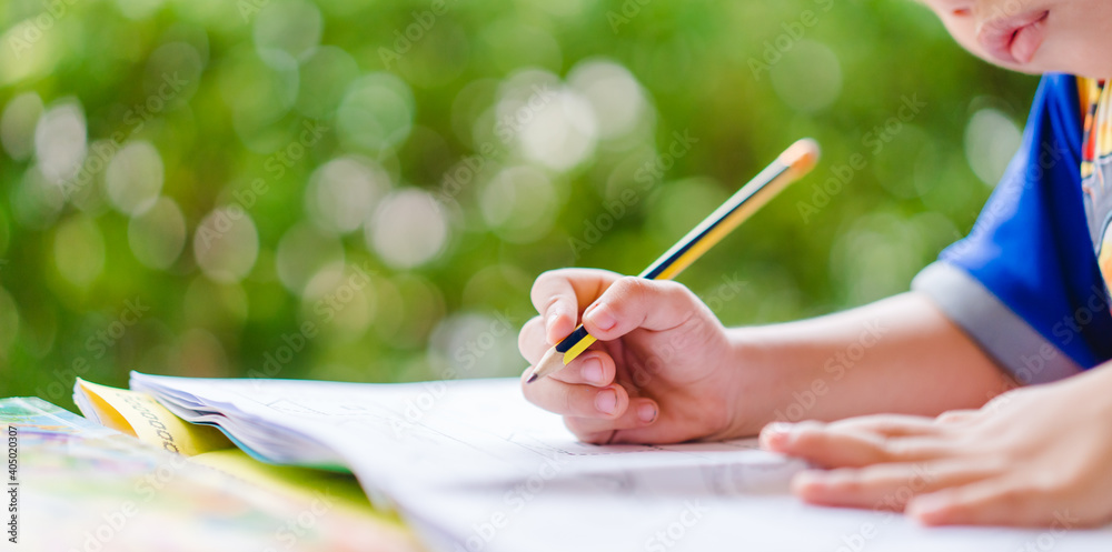 Toddler boy student online learning class study online video call zoom holding pencil writing english alphabet online with laptop at home.New normal.Covid-19 coronavirus.Social distancing.stay home