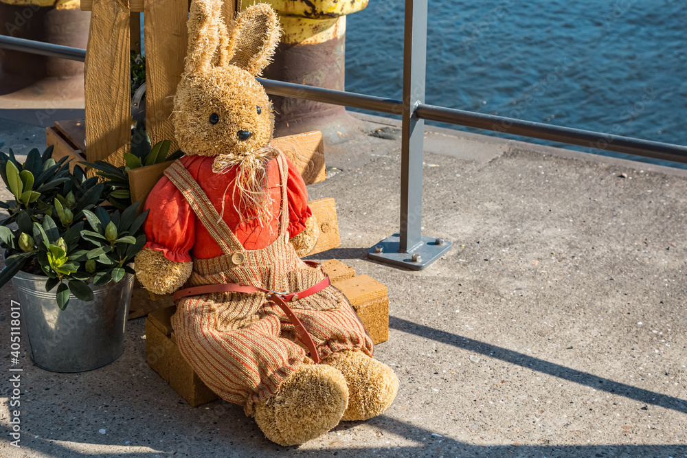 Ein Hase aus Stoff sitzt an einem Geländer
