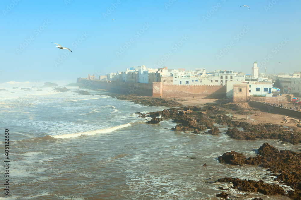 Scenic view of the old medina of Essaouira in sunny foggy morning, along the Atlantic, Morocco.