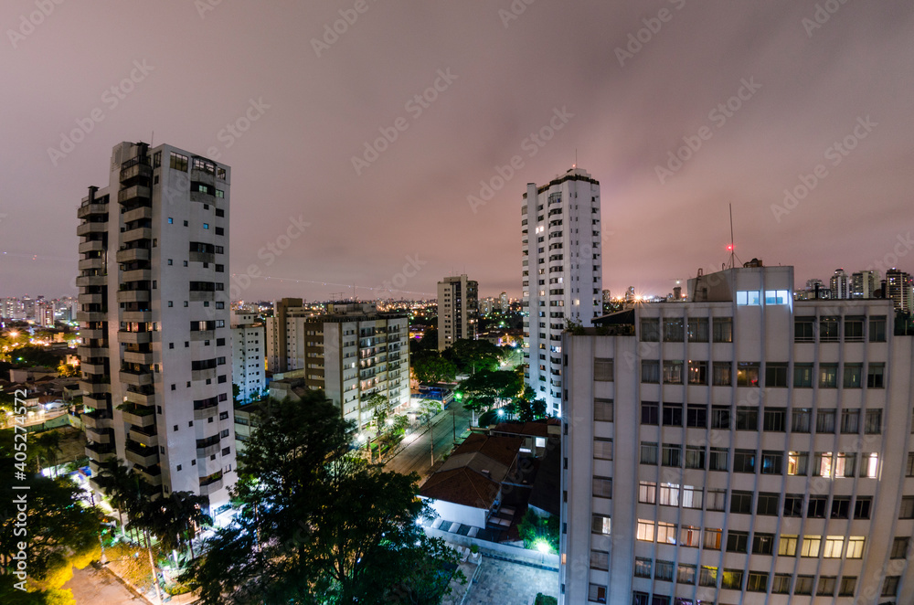 Night view of the city of São Paulo, neighborhoods of Campo Belo and Airport. Trace of lights from an airplane landing.