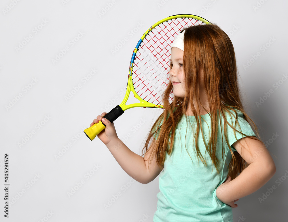 Redhead girl playing tennis head shot studio portrait isolated on white.