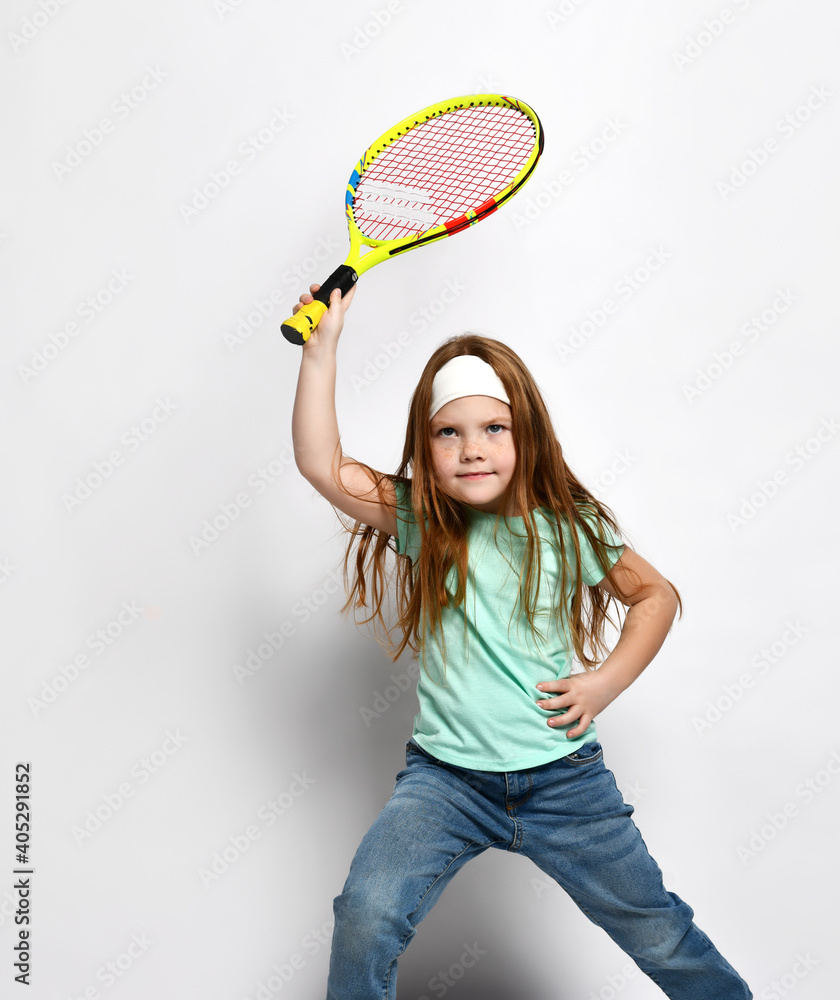 Beautiful red-haired girl playing tennis isolated studio shot. Little child player in trendy clothes, ready to hit the ball with a racket and shout loudly. Children sports, hobby for active lifestyle
