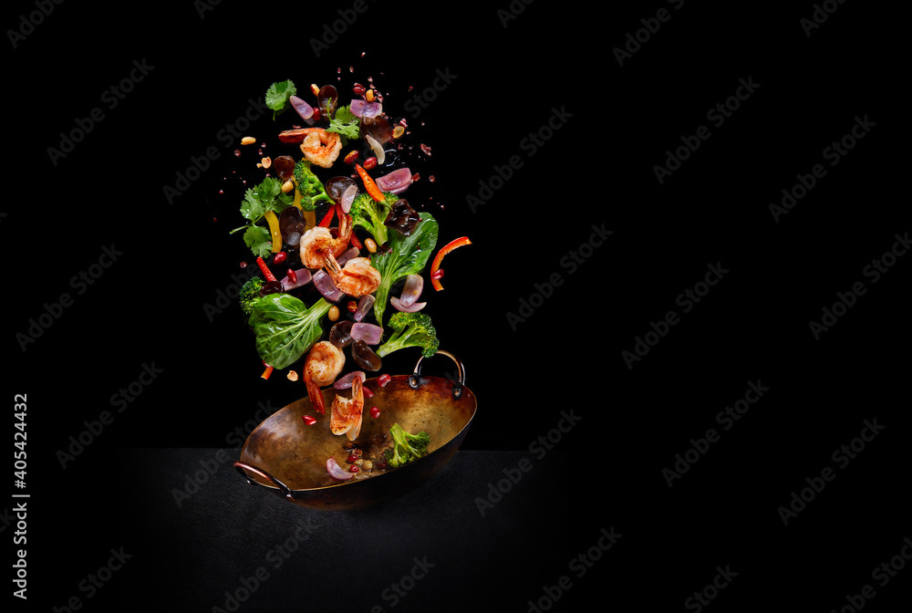 Flying wok ingredients - shrimp, vegetables, pak choi leaves, onions and peanuts. Asian food delivery. Chinese recipes. Wok preparation ingredients. Copy space.