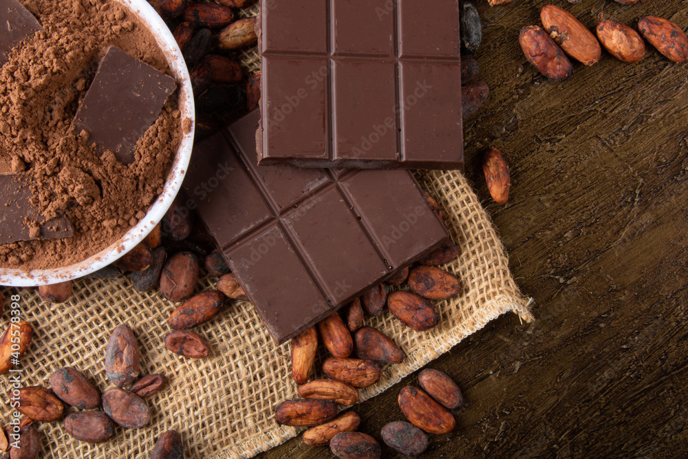 Powdered cocoa with pieces of chocolate on raw cocoa beans