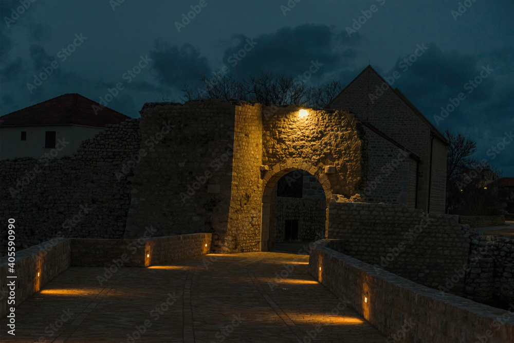 Old stone gate and bridge in medieval historic town of Nin at night. Dalmatia, Croatia