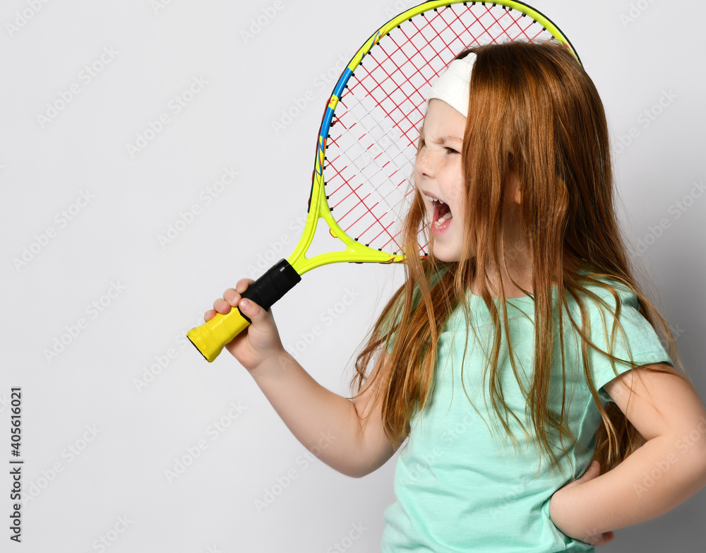 Angry evil girl big tennis player headshot studio portrait isolated on white. Furious sportive child holding racket shouting with anger. Frustration of losing or foul play. Negative attitude