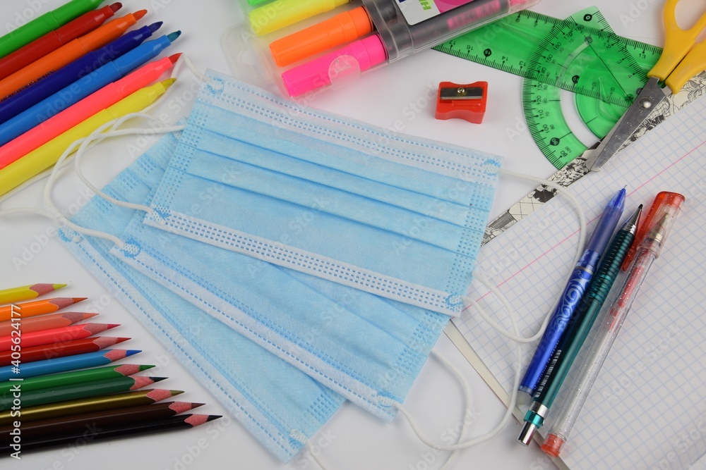 School supplies with medical face mask. Back to school ? during Covid 19 pandemic, protect and schooling in pandemic