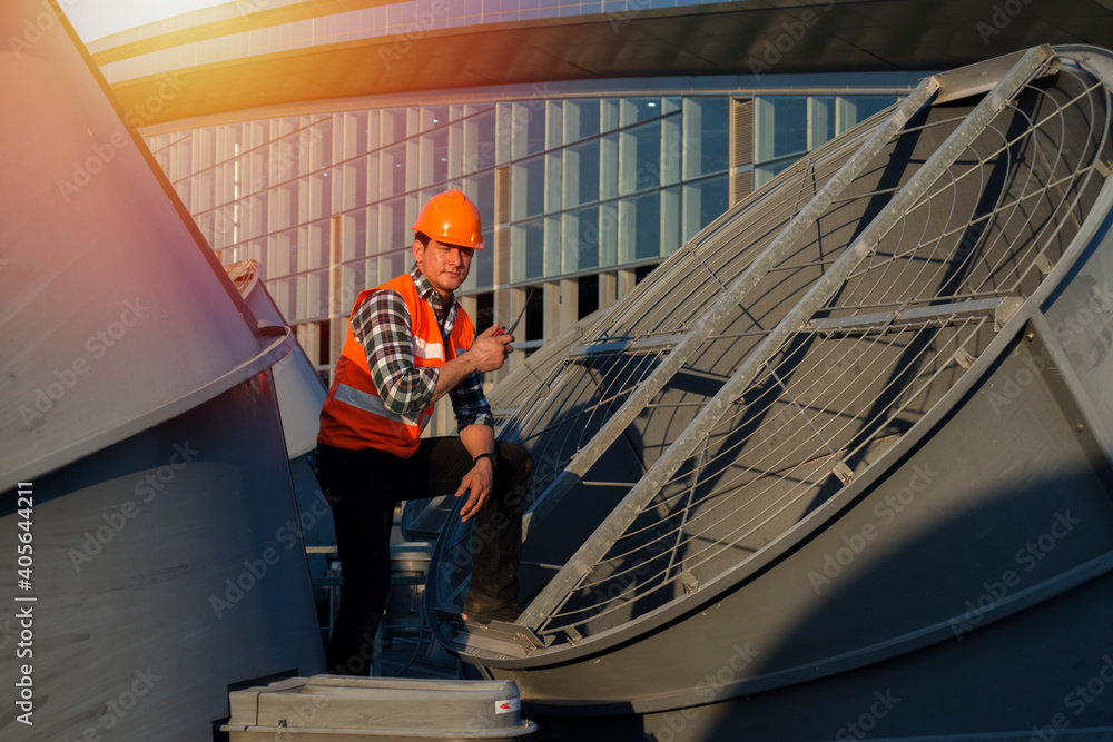engineer people service on cooling tower check belt and fan blade. cool ,construction,engineer,site,management,safety,civil,workers