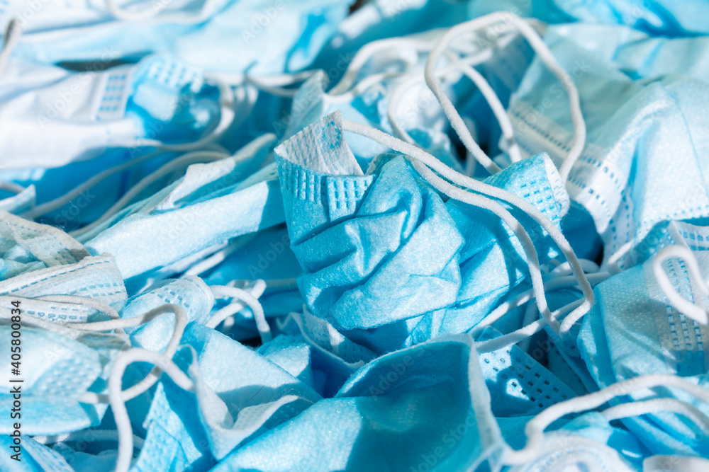 Texture of protective face masks, wrinkled trash, garbage, dirty and discarded, symbol of the health decadence and the global crisis of the COVID-19 pandemic.