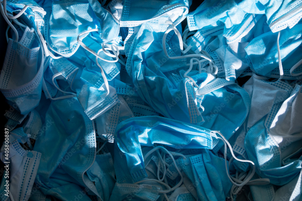 Texture of protective face masks, wrinkled trash, garbage, dirty and discarded, symbol of the health decadence and the global crisis of the COVID-19 pandemic.