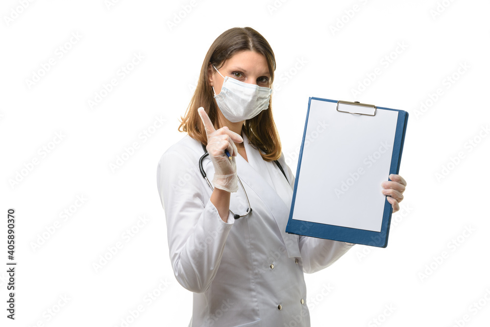 Girl doctor holds a tablet in her hands and shows a warning thumbs up
