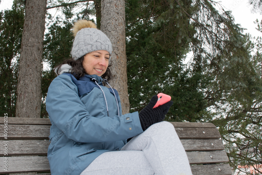 latin women using her phone in botanical garden montreal in the middle of the canadian winter