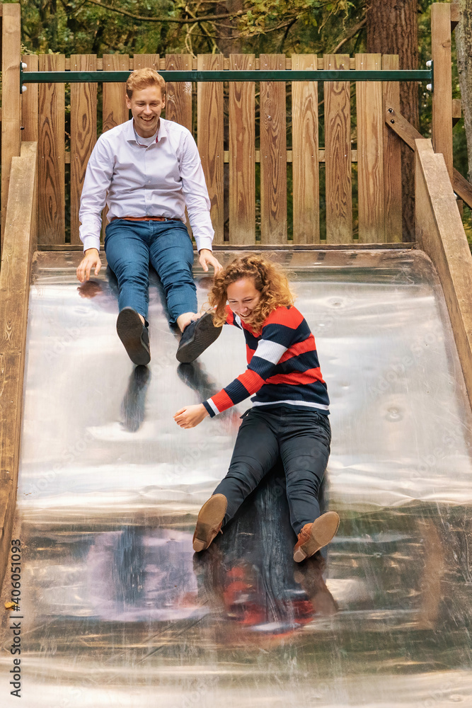 Young couple having a lot of fun on a big metal slide in the woo
