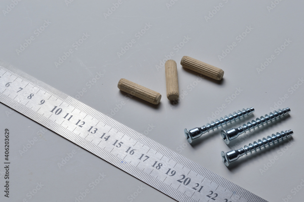 a ruler, a furniture screw and a wooden dowel lie on a light background. close-up.
