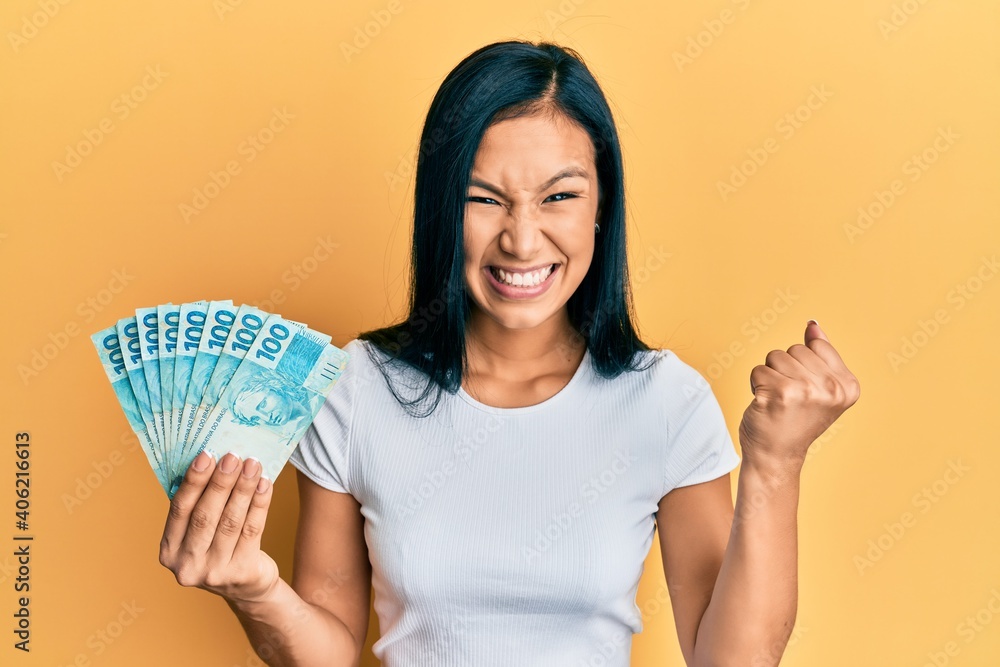 Beautiful hispanic woman holding 100 brazilian real banknotes screaming proud, celebrating victory and success very excited with raised arm