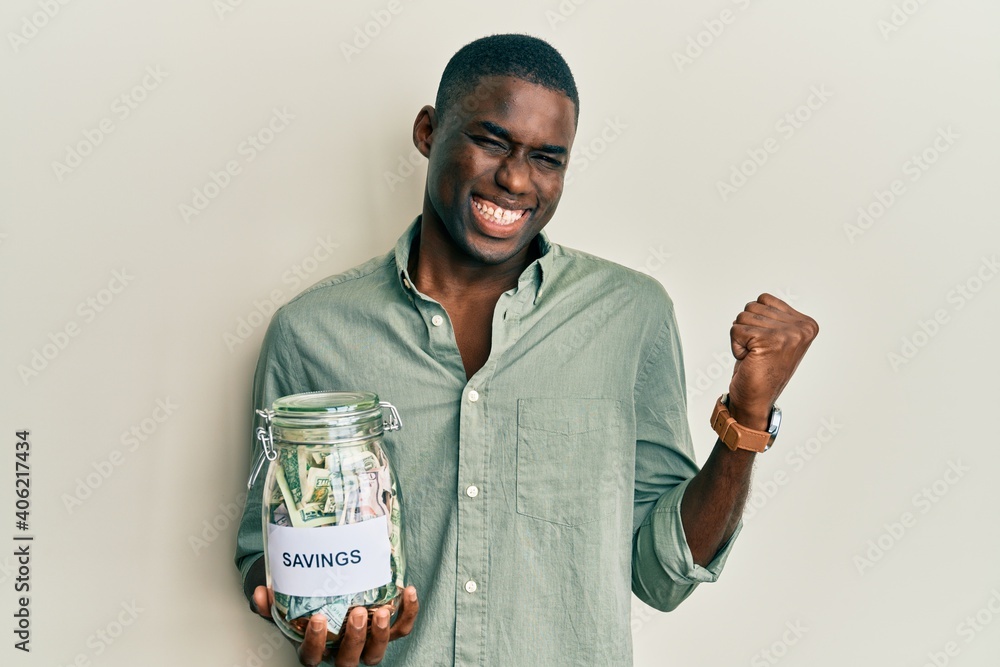 Young african american man holding jar with savings screaming proud, celebrating victory and success very excited with raised arm