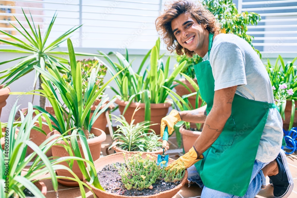 Young hispanic gardener smiling happy caring plants using garden shovel at terrace