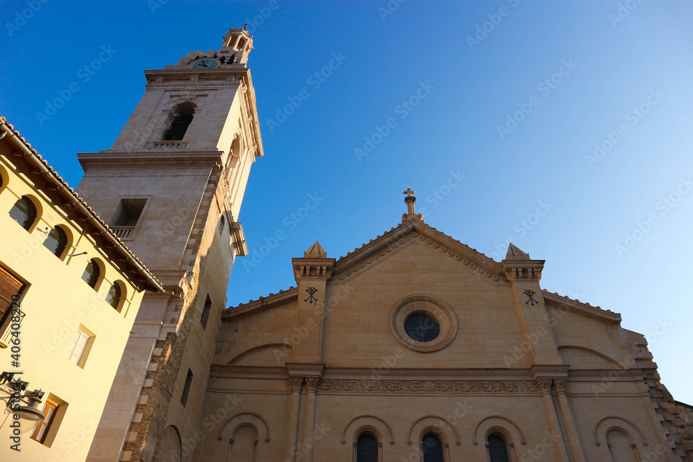 Winter view to the medieval Collegiate Basilica of Santa Maria of Xativa, Spain with blue sky on the background