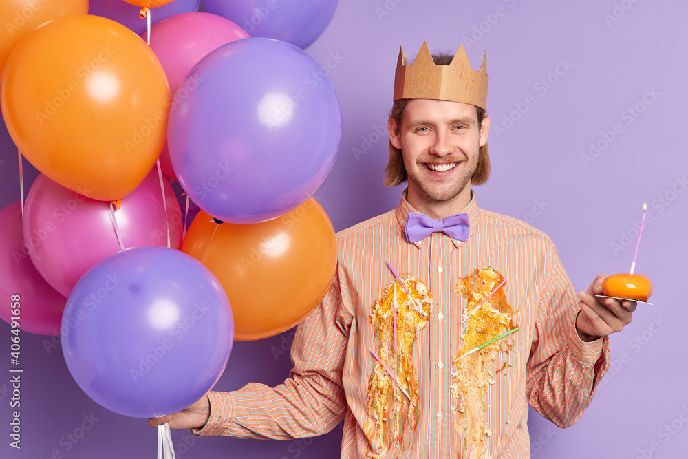 Cheerful young European man has fun on birthday party poses with cupcake and multicolored balloons wears dirty shirt smiles positively isolated over purple background. Holiday event concept.