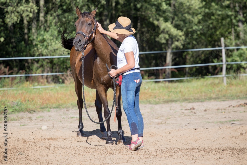 horse and woman friendship and trust. Arabian horse woman is stroking the horse