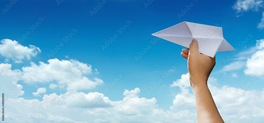 Hand is throwing origami paper airplane against blue sky with empty space for text, graphic showing concept of journey, travel, dream, freedom, start up, ne. Man's hand holding paper plane in the sky