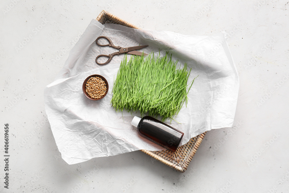 Fresh wheatgrass, seeds in bowl and bottle on light background