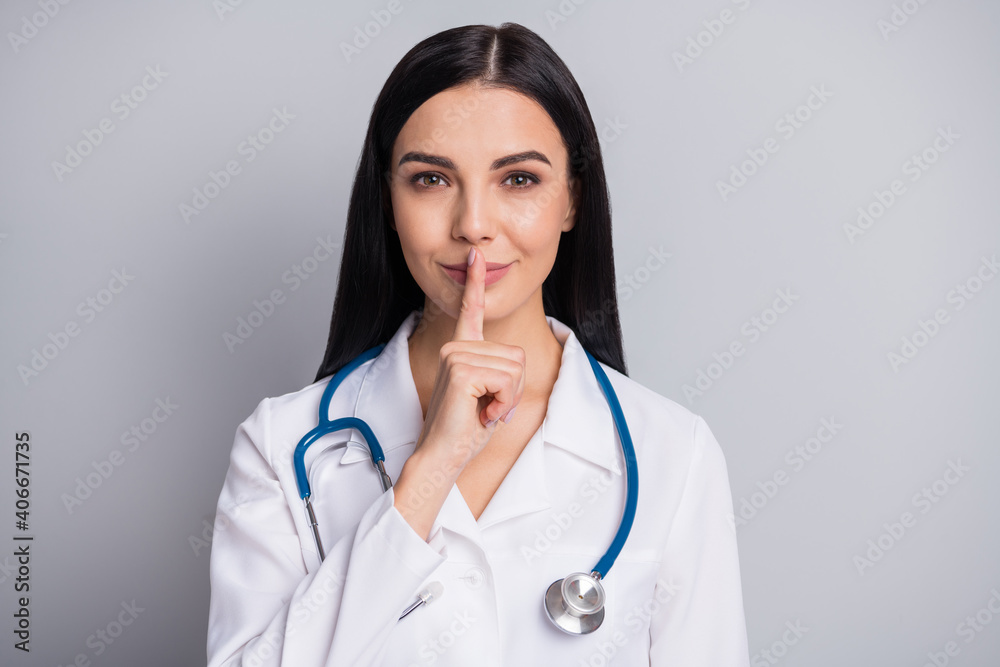 Photo of flirty doctor girl finger cover lips wear stethoscope white uniform isolated grey color background
