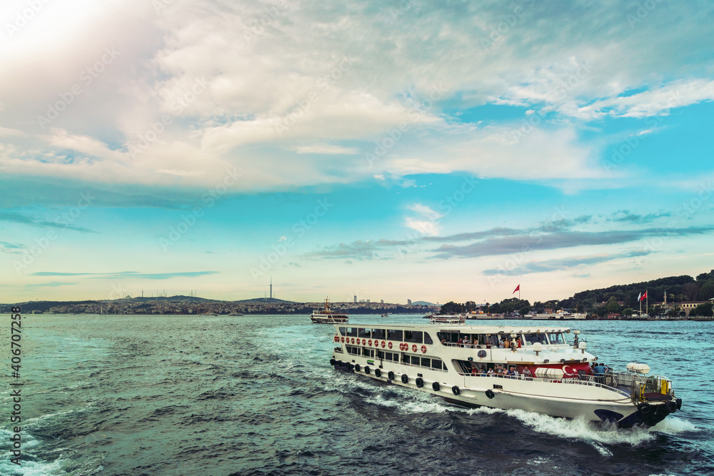 Passenger ferry boat carries people across the Bosphorus Strait along Istanbul, Turkey