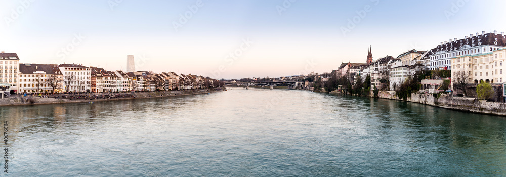 Panorama mit Rhein und Altstadt von Basel, Wettsteinbrücke und Münster, Schweiz