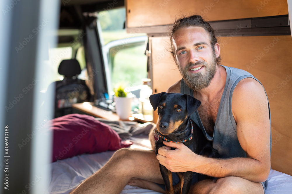 Man with his dog inside a caravan