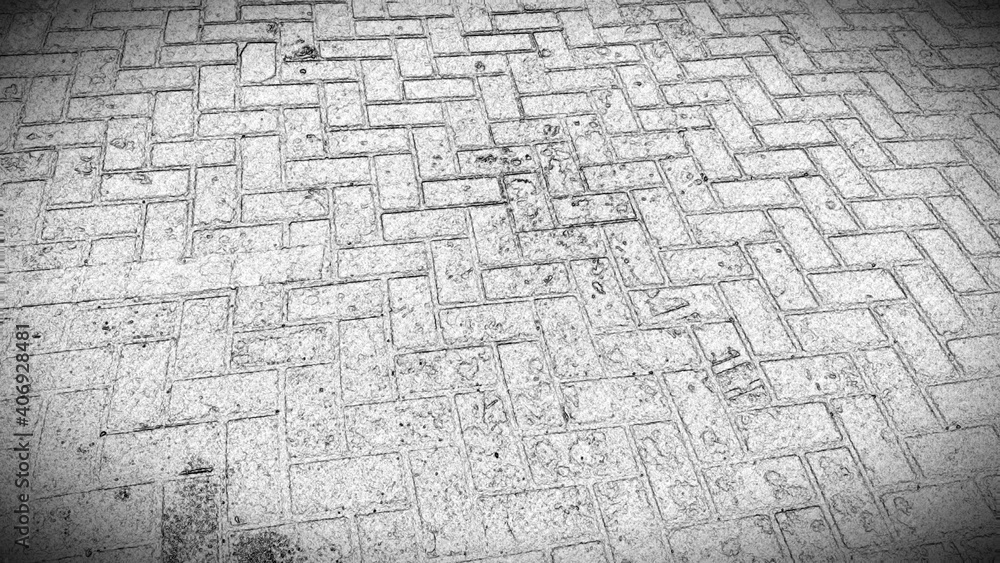 Black-white contour drawing of sidewalk tiles laid out in an ornament, identical rectangles create a drawing of a ladder.