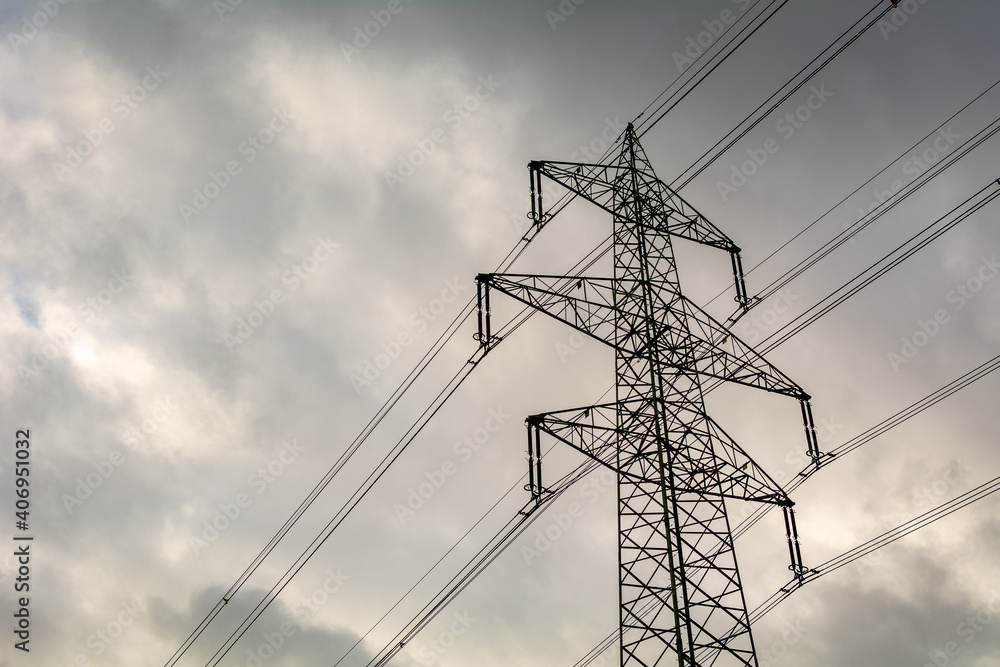 Electrical power mast in front of dark clouds as a concept of a possible power shortage (blackout)