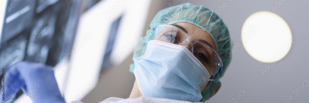 Female doctor against hospital lab background portrait. Medical x-ray research concept