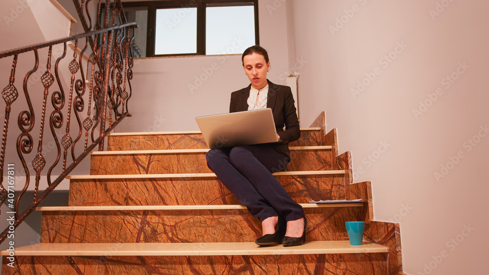 Employee using laptop overworking on deadline sitting on stairs in finance corporate company. Executive manager doing overtime at job on staircase businesspeople working in modern financial building.